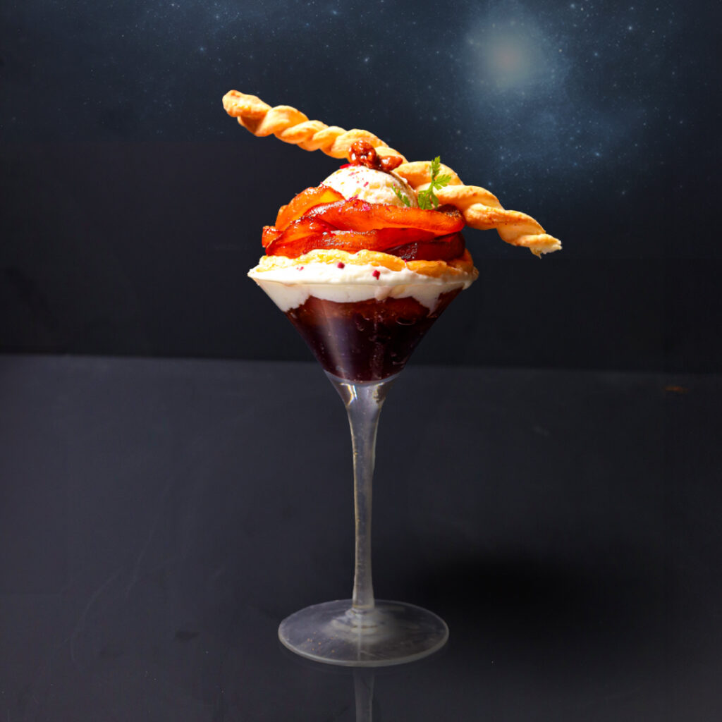 A beautiful parfait reminiscent of a red goldfish swimming gracefully through the night sky. The caramelized apples and the profound notes of red wine jelly harmonize with the refreshing crispness of green apples. The gentle sweetness of vanilla ice cream and the bittersweet caramel sauce enhance the delightful aroma of apples. Indulge in this enchanting and special parfait, perfect for a night of heartfelt tranquility.